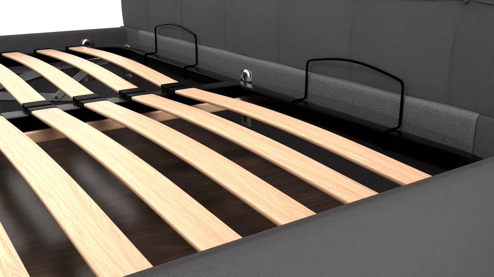 Rámová základna FRAME STORAGE obsahuje úložný prostor, do kterého lze ukrýt vše, co bude potřeba. Desky jsou vyrobeny z kvalitní MDF desky, která je odolná a pro zvýšení nosnosti a stability jsou umístěny na kovové výstuze základny. Tento typ základny neobsahuje postelový rošt a je tak vhodný například pro zákazníky, kteří preferují polohovací rošty.