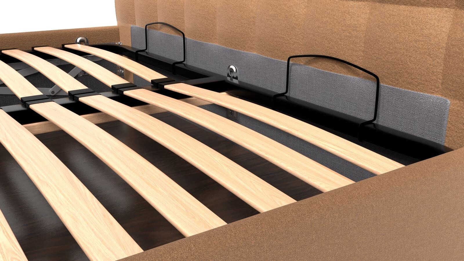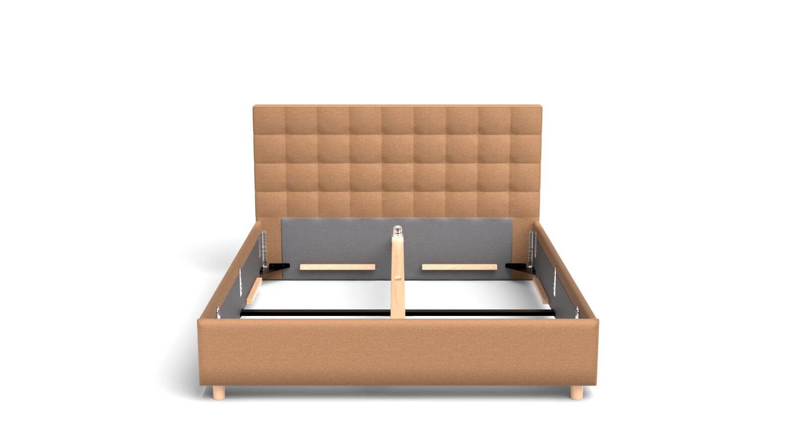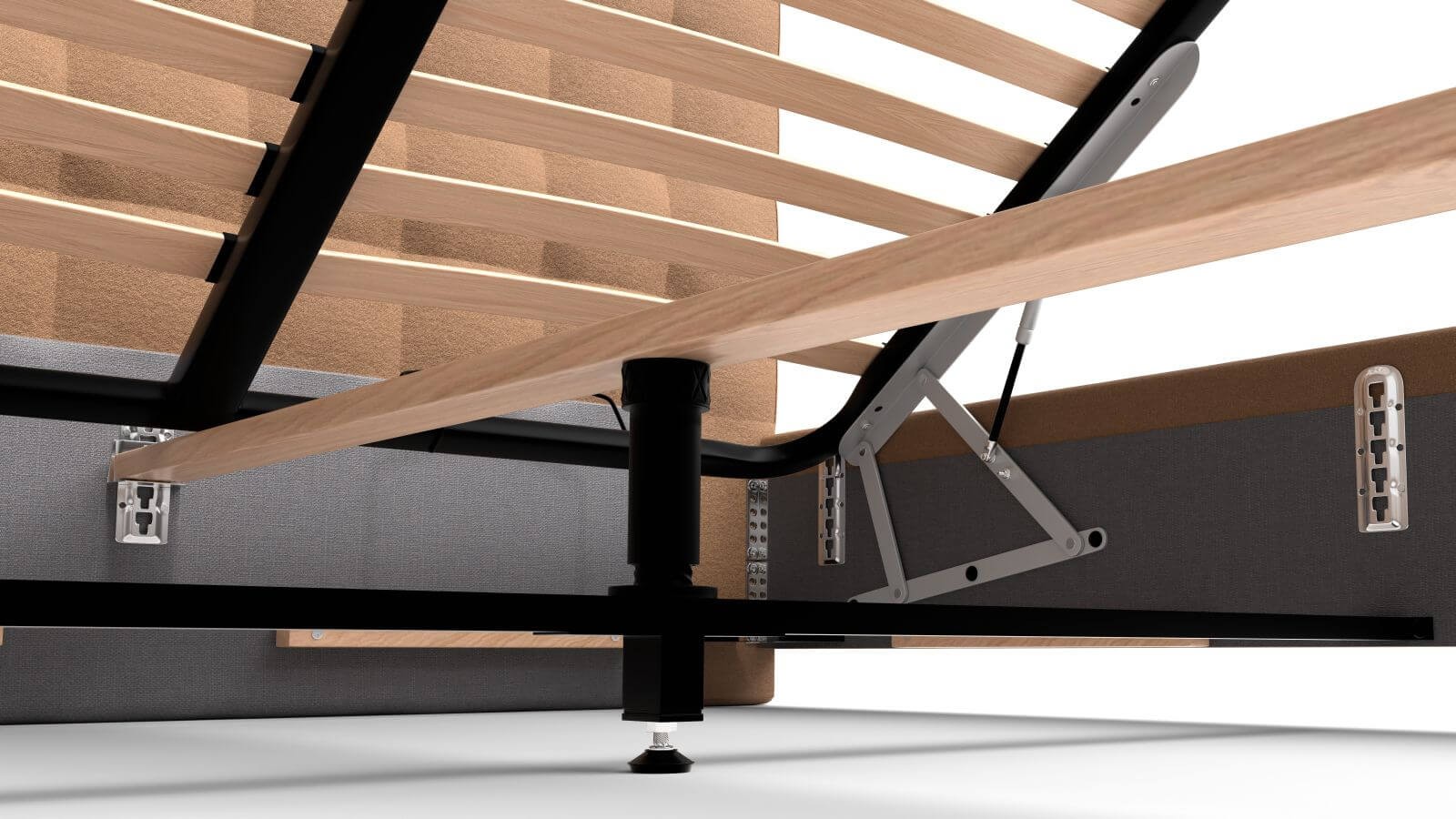 Rámová základna FRAME STORAGE obsahuje úložný prostor, do kterého lze ukrýt vše, co bude potřeba. Desky jsou vyrobeny z kvalitní MDF desky, která je odolná a pro zvýšení nosnosti a stability jsou umístěny na kovové výstuze základny. Tento typ základny neobsahuje postelový rošt a je tak vhodný například pro zákazníky, kteří preferují polohovací rošty.