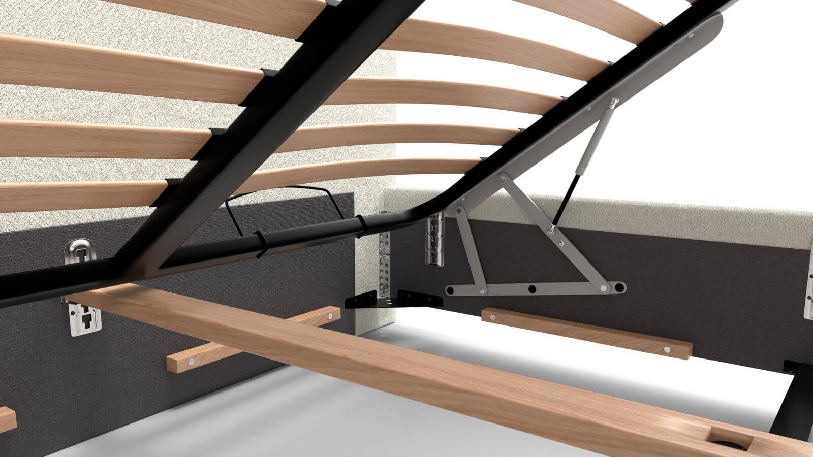 Rámová základna FRAME STORAGE obsahuje úložný prostor, do kterého lze ukrýt vše, co bude potřeba. Desky jsou vyrobeny z kvalitní MDF desky, která je odolná a pro zvýšení nosnosti a stability jsou umístěny na kovové výstuze základny. Tento typ základny neobsahuje postelový rošt a je tak vhodný například pro zákazníky, kteří preferují polohovací rošty.