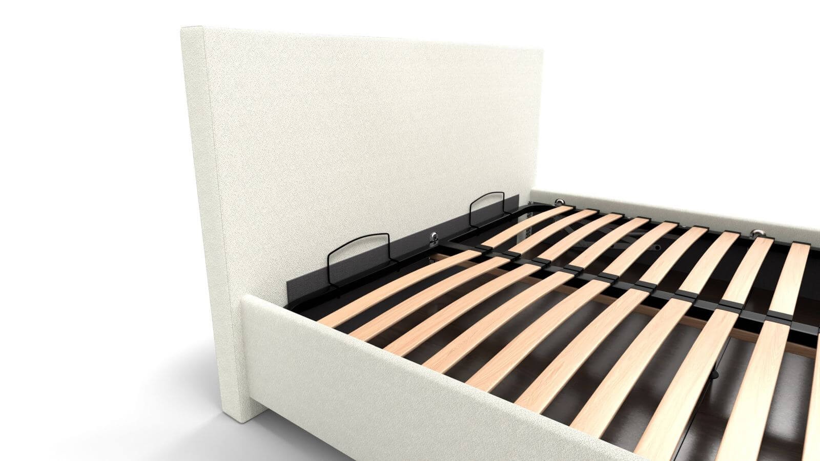 Rámová základna FRAME STORAGE obsahuje úložný prostor, do kterého lze ukrýt vše, co bude potřeba. Desky jsou vyrobeny z kvalitní MDF desky, která je odolná a pro zvýšení nosnosti a stability jsou umístěny na kovové výstuze základny. Tento typ základny neobsahuje postelový rošt a je tak vhodný například pro zákazníky, kteří preferují polohovací rošty.
