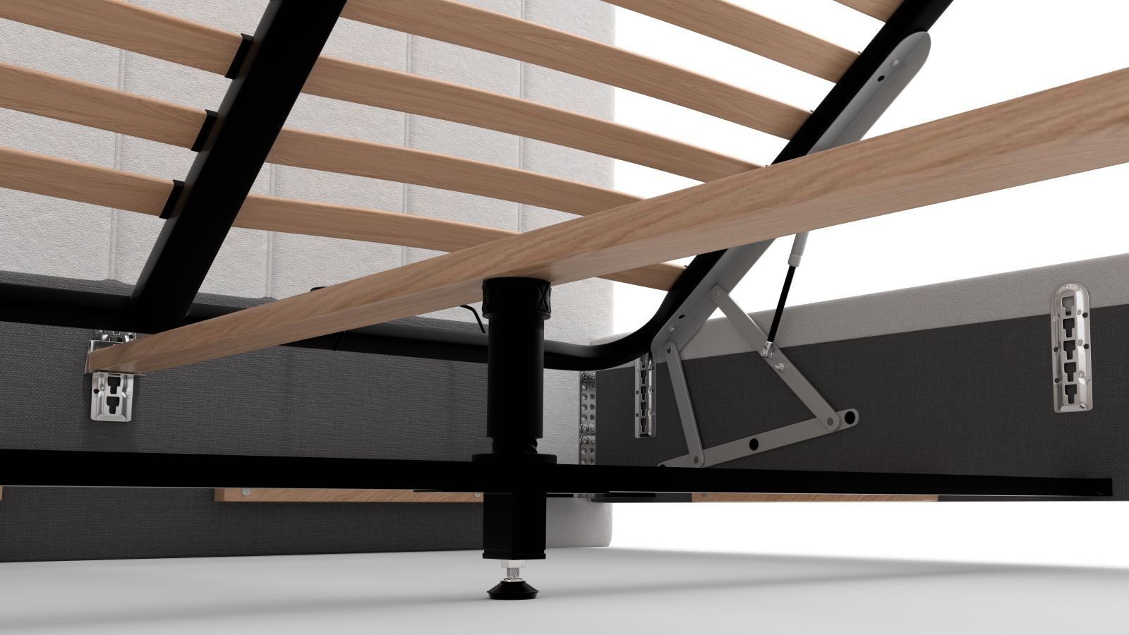 Rámová základna FRAME STORAGE obsahuje úložný prostor, do kterého lze ukrýt vše, co bude potřeba. Desky jsou vyrobeny z kvalitní MDF desky, která je odolná a pro zvýšení nosnosti a stability jsou umístěny na kovové výstuze základny. Tento typ základny neobsahuje postelový rošt a je tak vhodný například pro zákazníky, kteří preferují polohovací rošty.