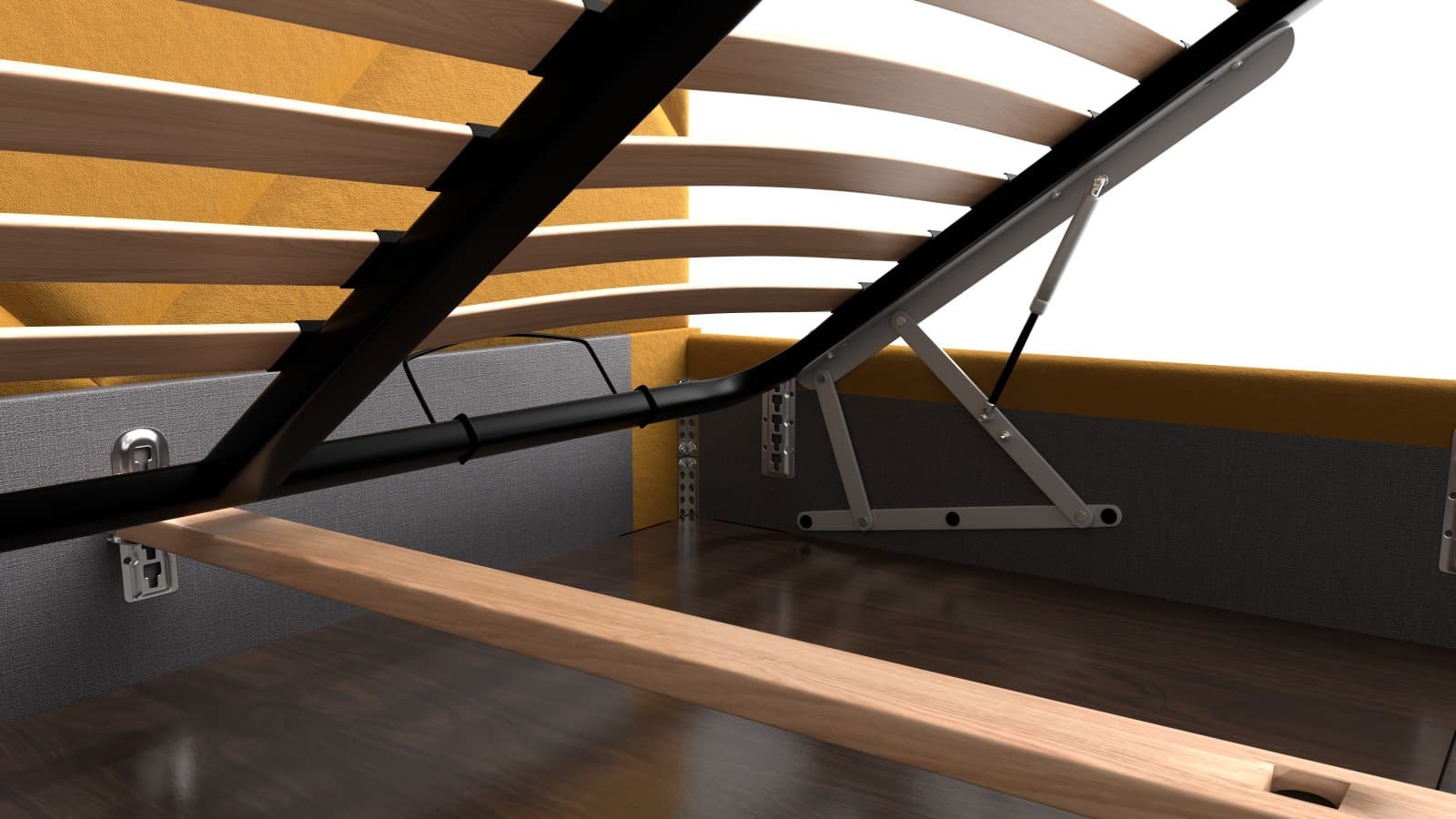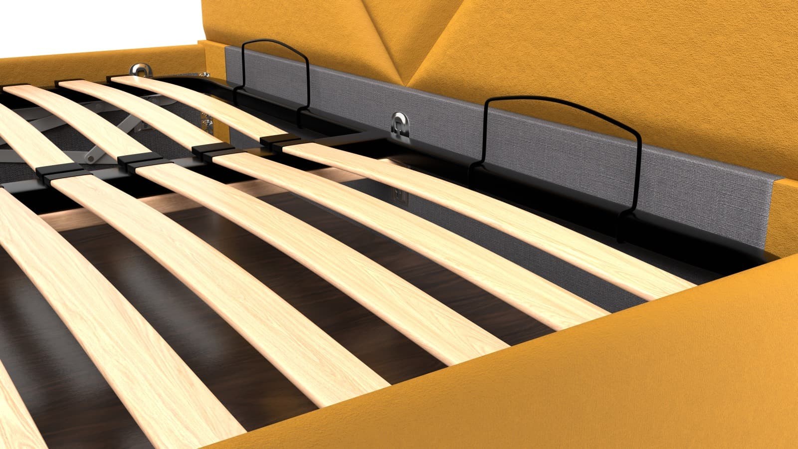 Rámová základna FRAME STORAGE obsahuje úložný prostor, do kterého lze ukrýt vše, co bude potřeba. Desky jsou vyrobeny z kvalitní MDF desky, která je odolná a pro zvýšení nosnosti a stability jsou umístěny na kovové výstuze základny. Tento typ základny neobsahuje postelový rošt a je tak vhodný například pro zákazníky, kteří preferují polohovací rošty.