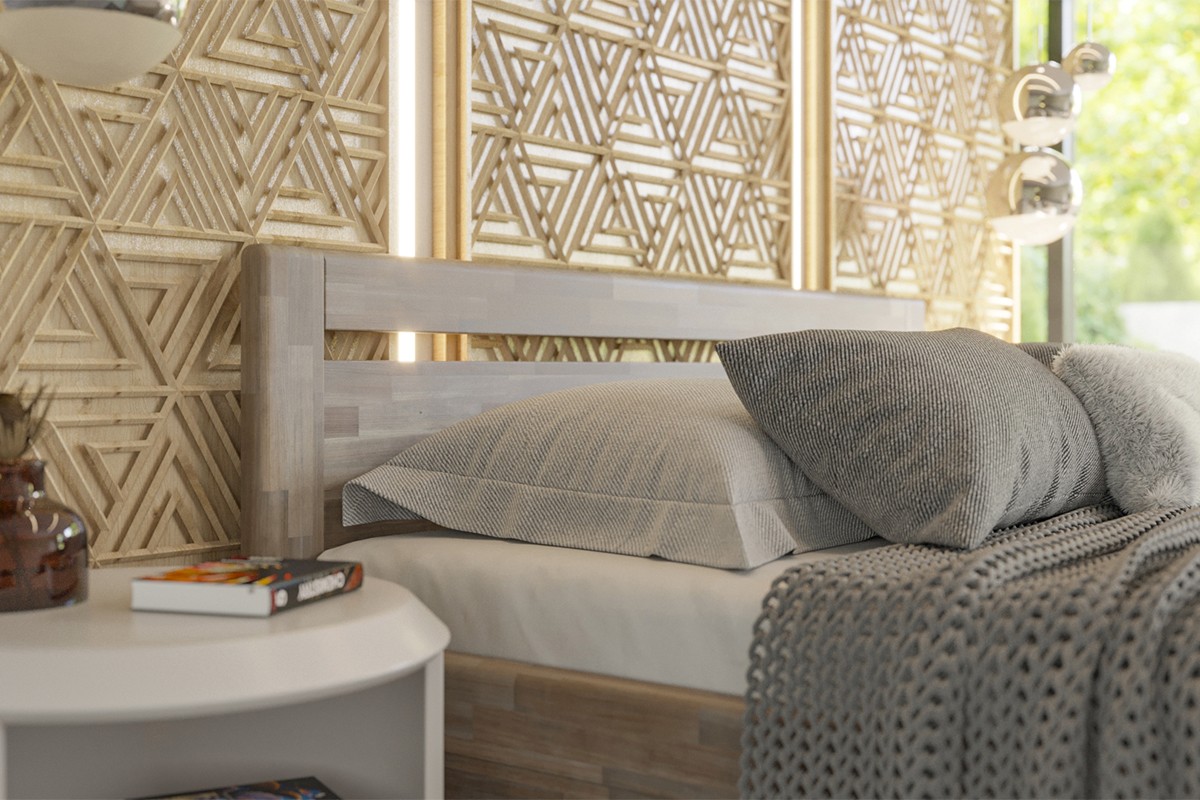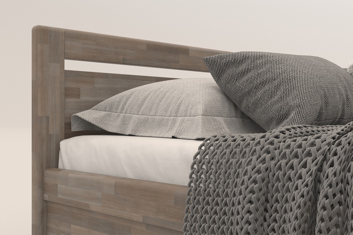 Zachovává vzhled tradiční české masivní postele blížící se modernímu skandinávskému stylu