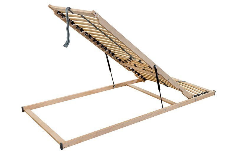 Rošt s výklopem nožní části pomocí pístu s přístupem do celého úložného prostoru. Rošt lze zvednout pomocí textilního úchytu. Lamely jsou uloženy po dvojicích v kaučukových pouzdrech, které jsou pružné a odolné. Jsou zároveň rozloženy do 3 anatomických zón pro optimální pocit opory a komfortu. Středový popruh zlepšuje stabilitu a nosnost roštu, posuvné objímky slouží k individuálnímu nastavení tuhosti v bederní části.