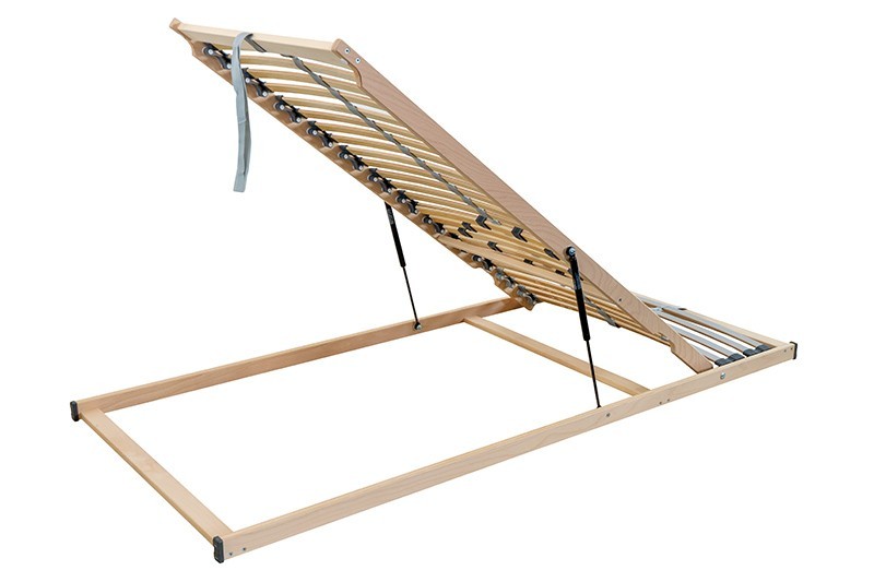 Rošt s výklopem v nožní části pomocí pístového mechanismu vám umožní přístup do celého úložného prostoru vaší postele. Rošt lze jednoduše zvednout díky odolnému textilního úchytu. Pružné lamely uložené ve dvojicích v kaučukových pouzdrech jsou rozložené do 5 anatomických zón. V ramenní oblasti najdete vrtané lamely, které zajišťují nižší tuhost, tím zmírňují tlak vyvíjený na ramena. Středový popruh zlepšuje stabilitu a zvyšuje nosnost roštu. Posuvnými objímkami lze individuálně nastavit tuhost v bederní části roštu.